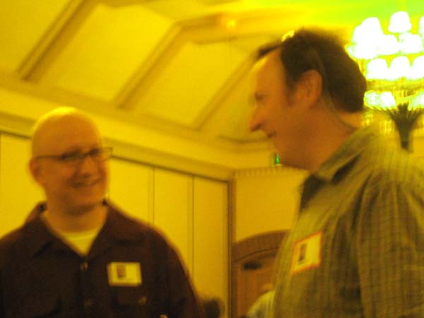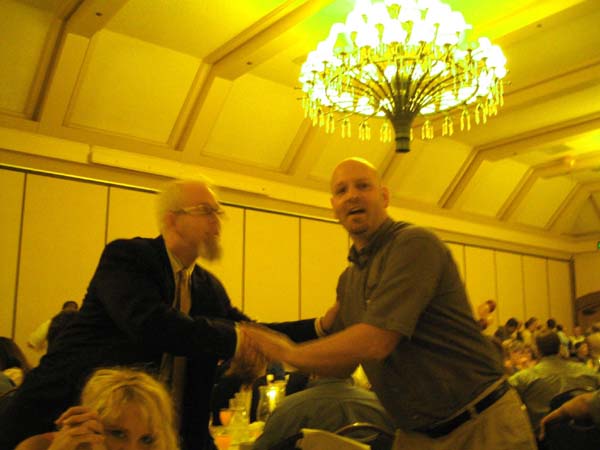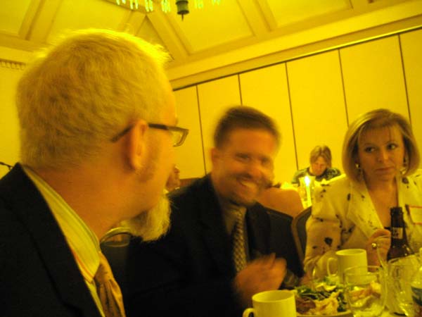 █████ disappeared almost right off with my good friend Darin Goff's wife Lani to secure a good table for the banquet. They had never met before, but hit it right off. Together they snagged a perfect location—close to the front, but right next to a door in case any of us needed to slip out. Another good friend, Brett Clay, joined us at the table with his wife Therese, and I was pleased to see we were all drinking. Yes, there was a bar at the banquet—supplemented by the Talisker I had smuggled inside in my Scottish hip flask, and which we not-so-furtively shared around the table. (Well, actually, I elected to hold off until after my speech, seeing no point in overlubricating my tongue.)