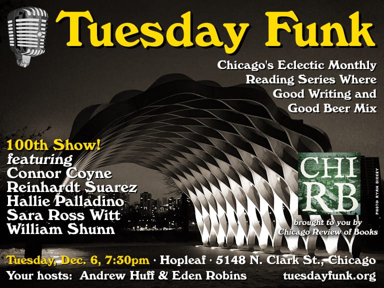 I'm delighted to be appearing tonight at a very special edition of Chicago's Tuesday Funk reading series. It's the 100th episode of the long-running series. In honor of that occasion, current hosts Andrew Huff and Eden Robins have invited all the former hosts back